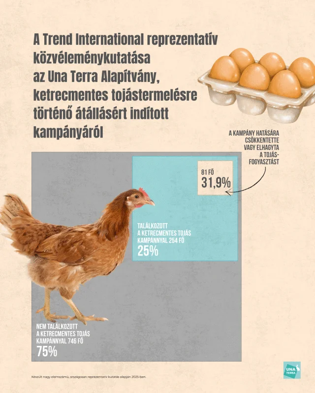 Az Una Terra és a Eurogroup for Animals 2025 júniusában végzett szintén reprezentatív kutatása pedig megmutatta, hogy a megkérdezettek 25%-a találkozott a ketreces tojás kampánnyal, és annak hatására körülbelül 760.000 fő (8%) váltott ketrecmentes tojásra, vagy csökkentette tojásfogyasztását. fiatalabb korosztály lényegesen érzékenyebb a témára: a 18-34 évesek 32%-a, ezen belül a Z-generáció 37%-a találkozott a kampánnyal. A kampány hatására az előbbi korosztály 14, az utóbbinak 18%-a csökkentette vagy teljesen elhagyta a tojásfogyasztást.